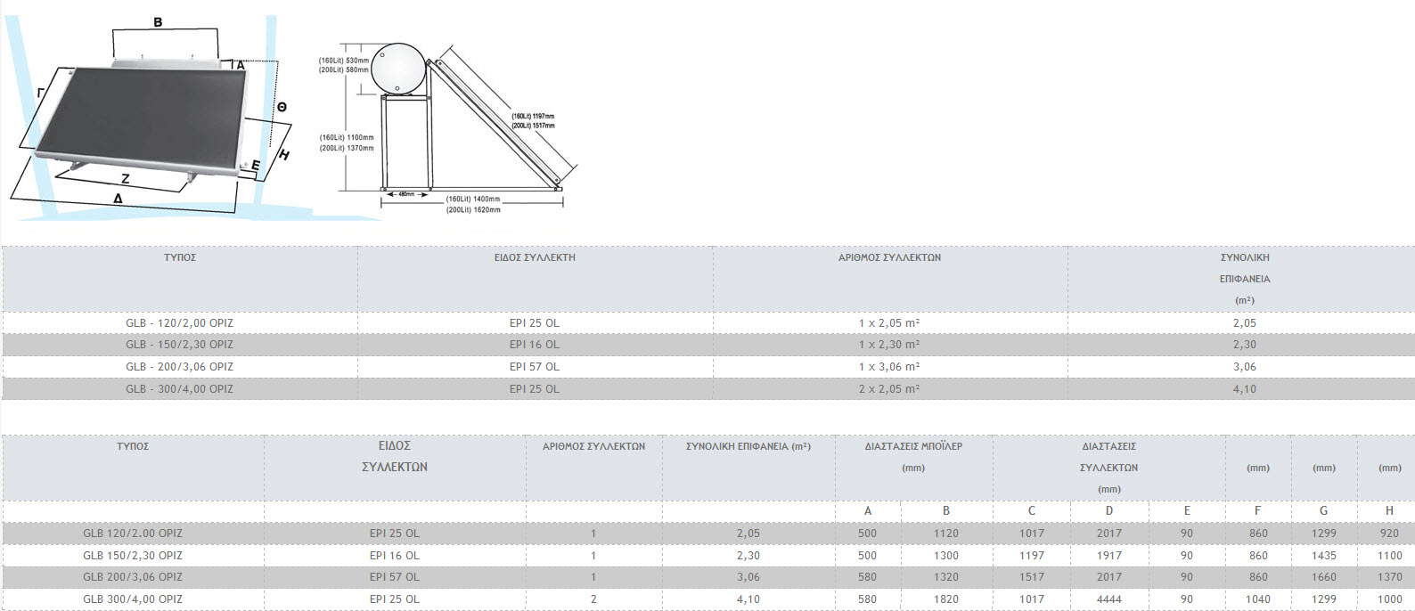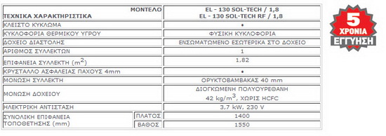 Τύπος | Χωρητικότητα Lt | Επιλογή Ενέργειας | Ηλεκτρική Ισχύς Watt | Εξυπηρέτηση ατόμων | Τάση 50-60Hz Volt | Διαστάσεις Συλλεκτών (mm) | Αριθμός Συλλεκτών | Εμβαδόν Συλλέκτη m2 | Μόνωση Διογκ. Πολυουρεθάνης χωρίς CFC-cm | Βάρος Μονάδας κενή | Εξωτερικό Περίβλημα |