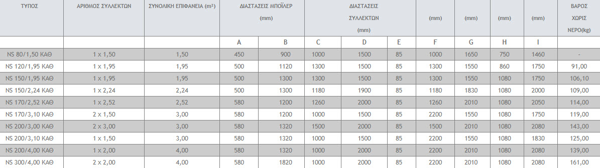 Τύπος | Χωρητικότητα Lt | Επιλογή Ενέργειας | Ηλεκτρική Ισχύς Watt | Εξυπηρέτηση ατόμων | Τάση 50-60Hz Volt | Διαστάσεις Συλλεκτών (mm) | Αριθμός Συλλεκτών | Εμβαδόν Συλλέκτη m2 | Μόνωση Διογκ. Πολυουρεθάνης χωρίς CFC-cm | Βάρος Μονάδας κενή | Εξωτερικό Περίβλημα |