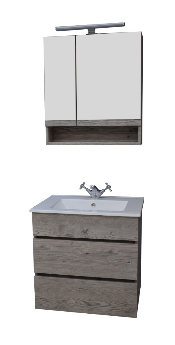 Καθρέπτης μπάνιου 60cm, της συλλογής ΡΟΜΙΝΑ, με δυο ντουλάπια, ένα εμφανές ράφι και φωτιστικό τύπου απλίκα, σε καφέ απόχρωση και εφε ξύλου (κωδ.718).