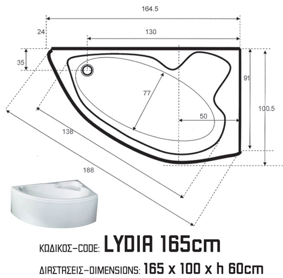 Απλή εντοιχιζόμενη μπανιέρα Lydia, ακρυλική, δεξιά για γωνιακή τοποθέτηση, διαστάσεων 165x100cm.