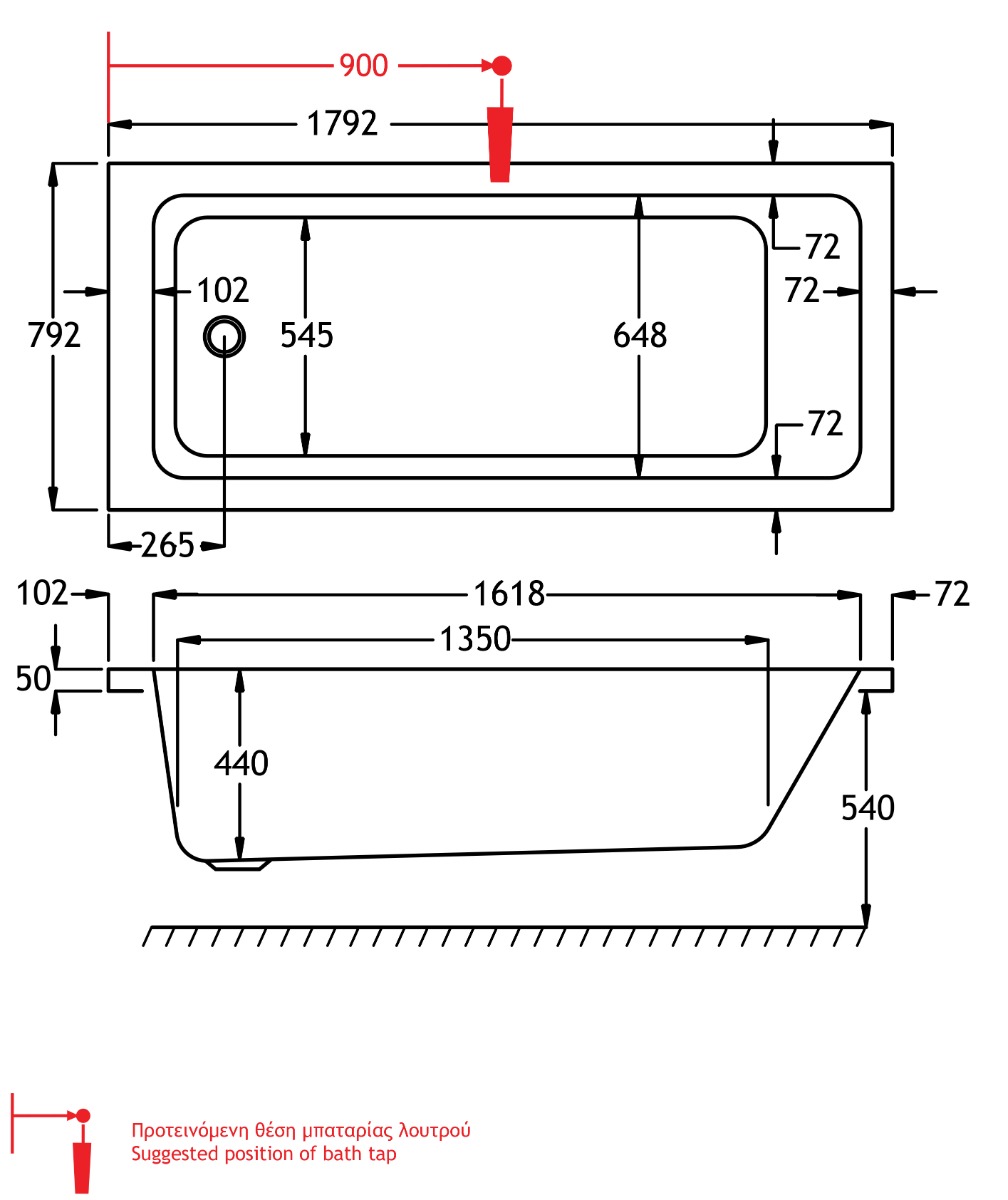 Μπανιέρα ορθογώνια, ακρυλική με ενίσχυση Carronite, σε διάσταση 180x80cm.