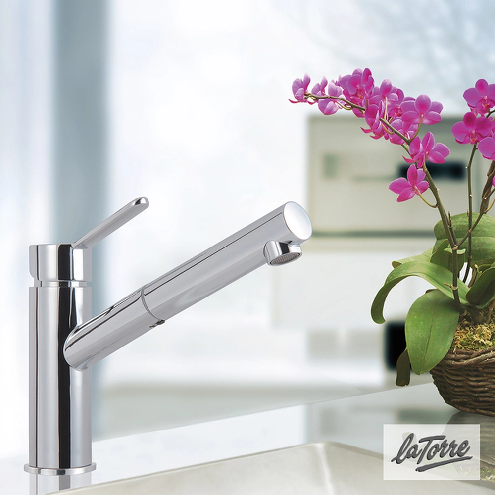Μπαταρία νεροχύτου θερμομικτική NEWPRO με περιστρεφόμενο κορμό κσι συρόμενο ντούζ με άθραυστο σπιράλ, LA TORRE Ιταλίας