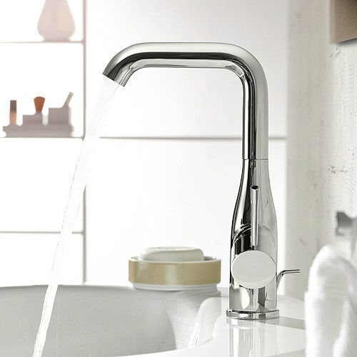 Επικαθήμενη αναμεικτική μπαταρία νιπτήρος Essence με σύστημα εξοικονόμησης νερού, με υψηλό περιστρεφόμενο στόμιο και αναδυόμενη βαλβίδα σε χρωμέ φινίρισμα, από τη Grohe.