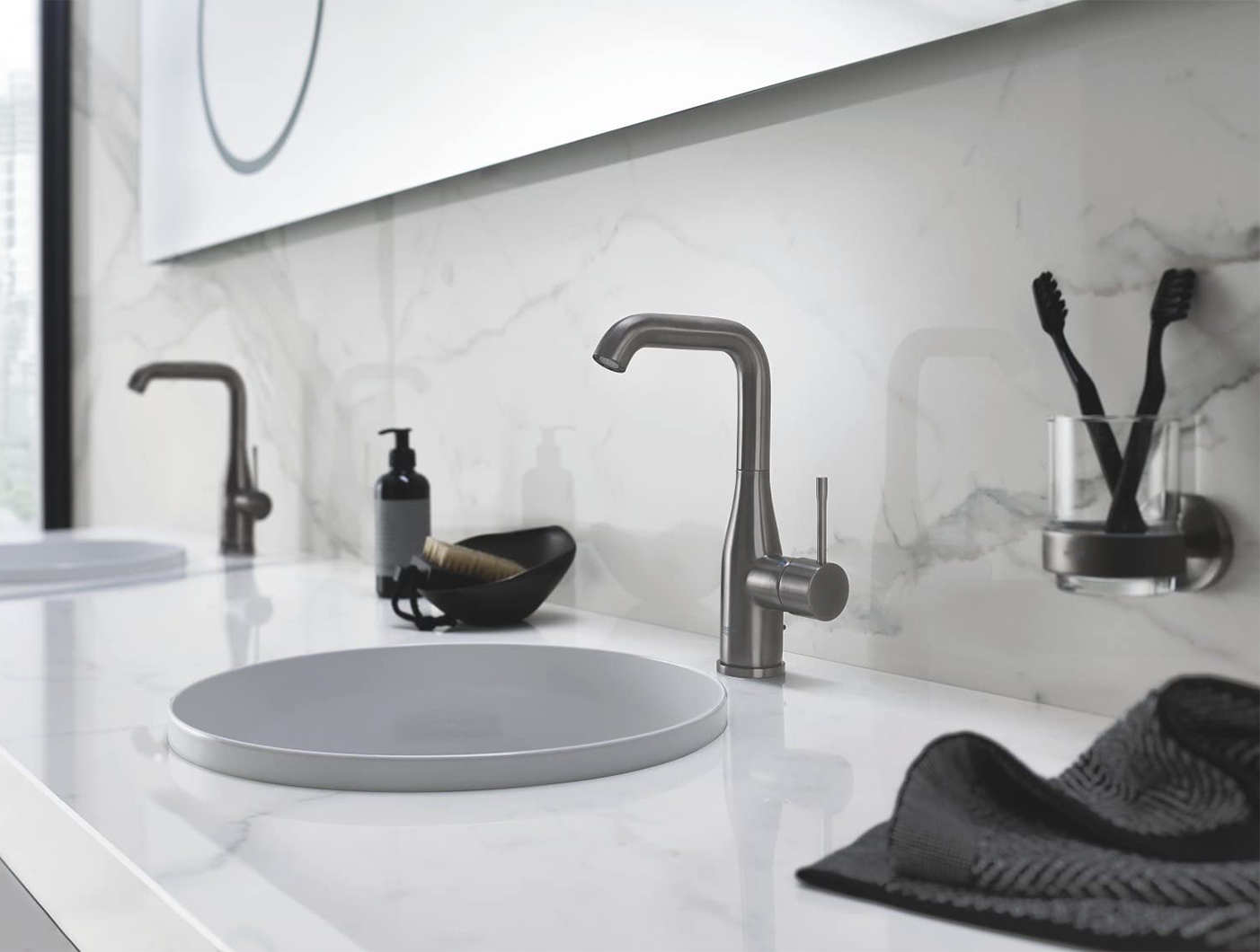 Επικαθήμενη αναμεικτική μπαταρία νιπτήρος Essence Brushed Hard Graphite με PVD τεχνολογία βαψίματος, από τη Grohe.