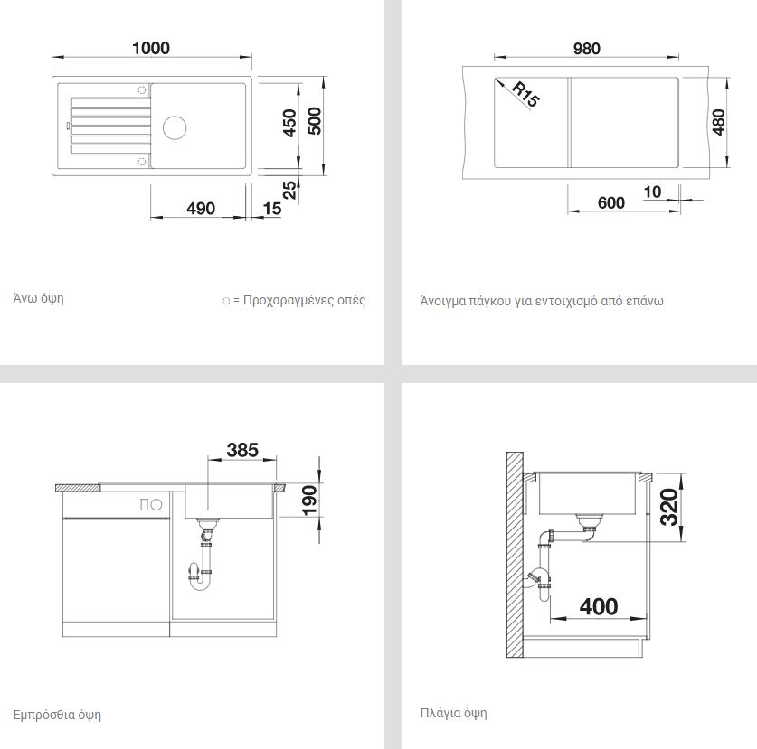 Βάση Ντουλάπι (cm) | Εξωτερική Διάσταση Μ/Π (mm) | Άνοιγμα Πάγκου (mm) | Διάσταση Γούρνας Μ/Π/Υ (mm) | Βαλβίδα/Υπερχείλιση |