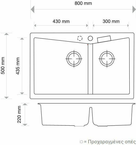 Βάση Ντουλάπι (cm) | Εξωτερική Διάσταση Μ/Π (mm) | Διάσταση Γούρνας Μ/Π/Υ (mm) | Εκροή (mm) | Βαλβίδα/Υπερχείλιση | Υφή |