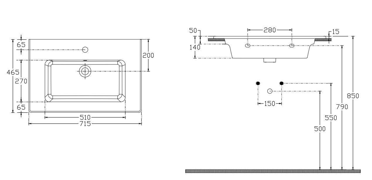 Πορσελάνινος νιπτήρας Flat, διάστασης 71,5×46,5cm, ένθετης τοποθέτησης.