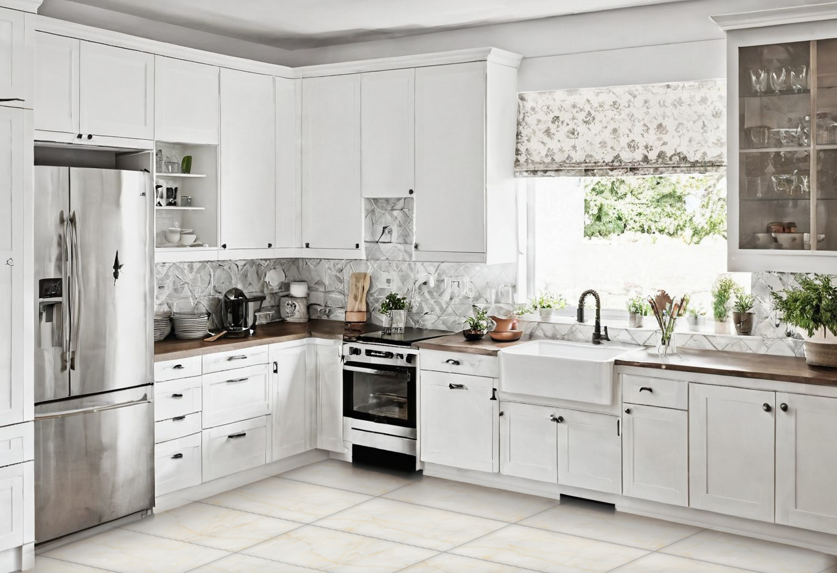 Γρανιτοπλακάκι δαπέδου σε ύφος μαρμάρου με μπεζ-άσπρες λεπτομέρειες και με σατινέ υφή.