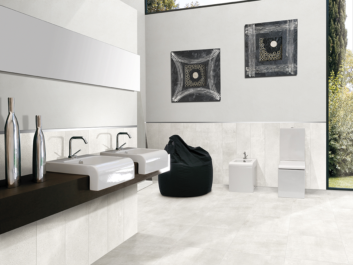 Γρανιτοπλακάκι δαπέδου μεγάλης διάστασης της σειράς Extra σε λευκή απόχρωση με δείκτη αντιολίσθησης R10 και ματ υφή σε ύφος τσιμέντου.
