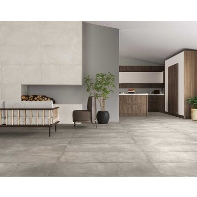 Πλακάκι δαπέδου γκρι απόχρωσης σε εφέ τσιμέντου εμπορικής διαλογής της σειράς Inedit Perla με ματ υφή και διάσταση 60x120cm.