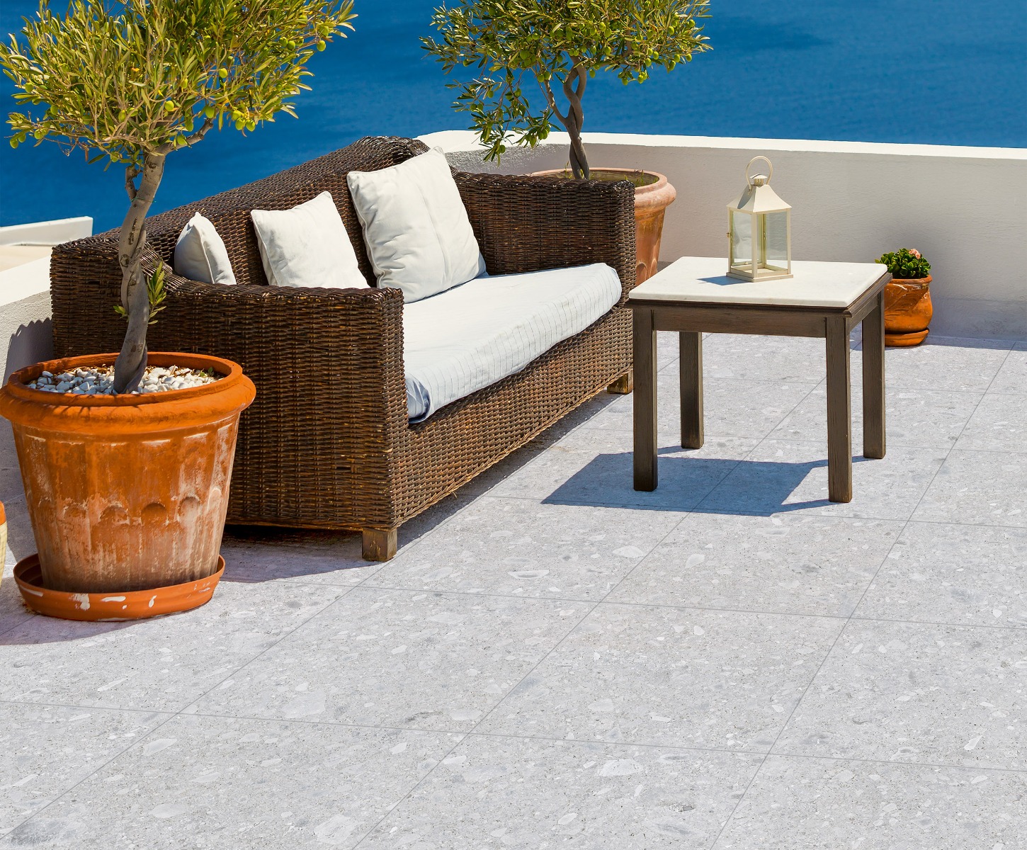 Γρανίτης πρώτης ποιότητας Ιταλικής προέλευσης, με ματ υφή R10, σε ύφος πέτρας – μωσαϊκού terrazzo, και διάσταση 60x120cm.