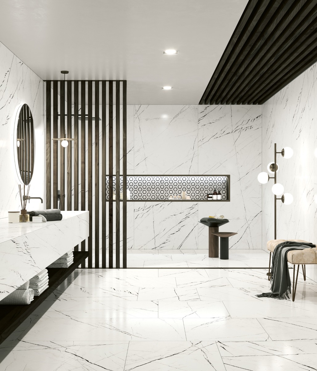 Σε ύφος μαρμάρου με ματ υφή και πάχος 6 mm και κορυφαία ποιοτικά χαρακτηριστικά, στην επιβλητική διάσταση των 120x280cm, το Marquina White δημιουργεί εντυπωσιακές επενδύσεις σε τοίχους και δάπεδα όλων των χώρων της κατοικίας σας ή του επαγγελματικού σας χώρου.