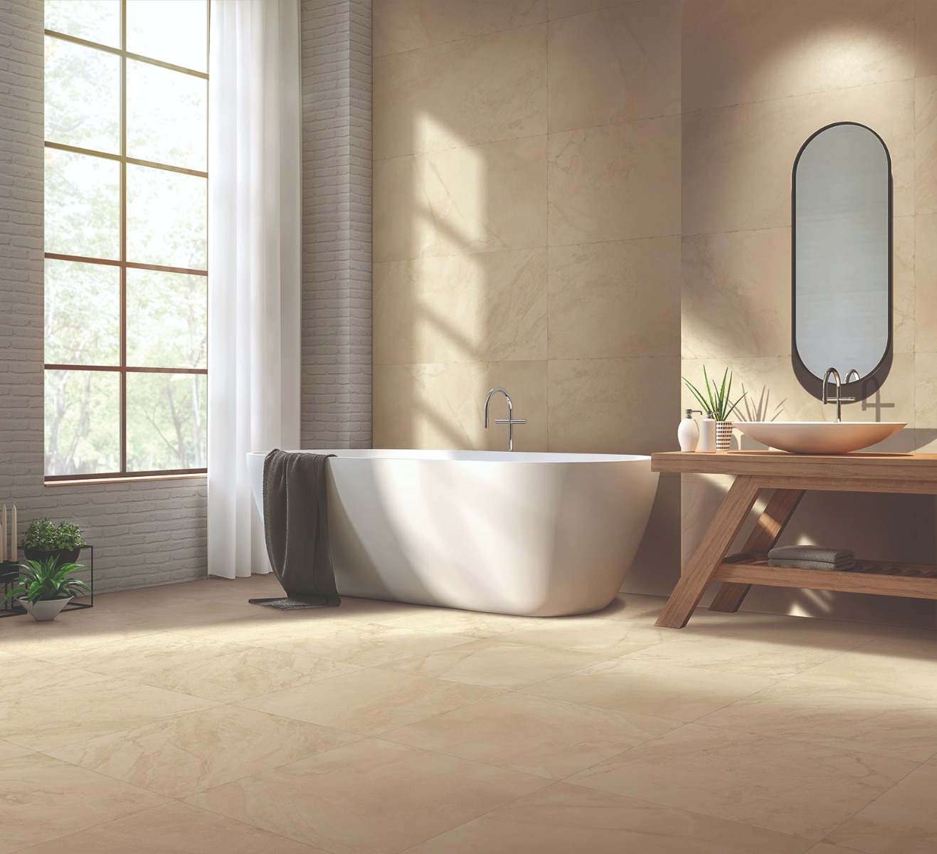 Γρανιτοπλακάκι κατάλληλο για τοποθέτηση σε δάπεδο ή τοίχο σε μπεζ απόχρωση με εφέ πέτρας και μεγάλη διάσταση 60x120cm.