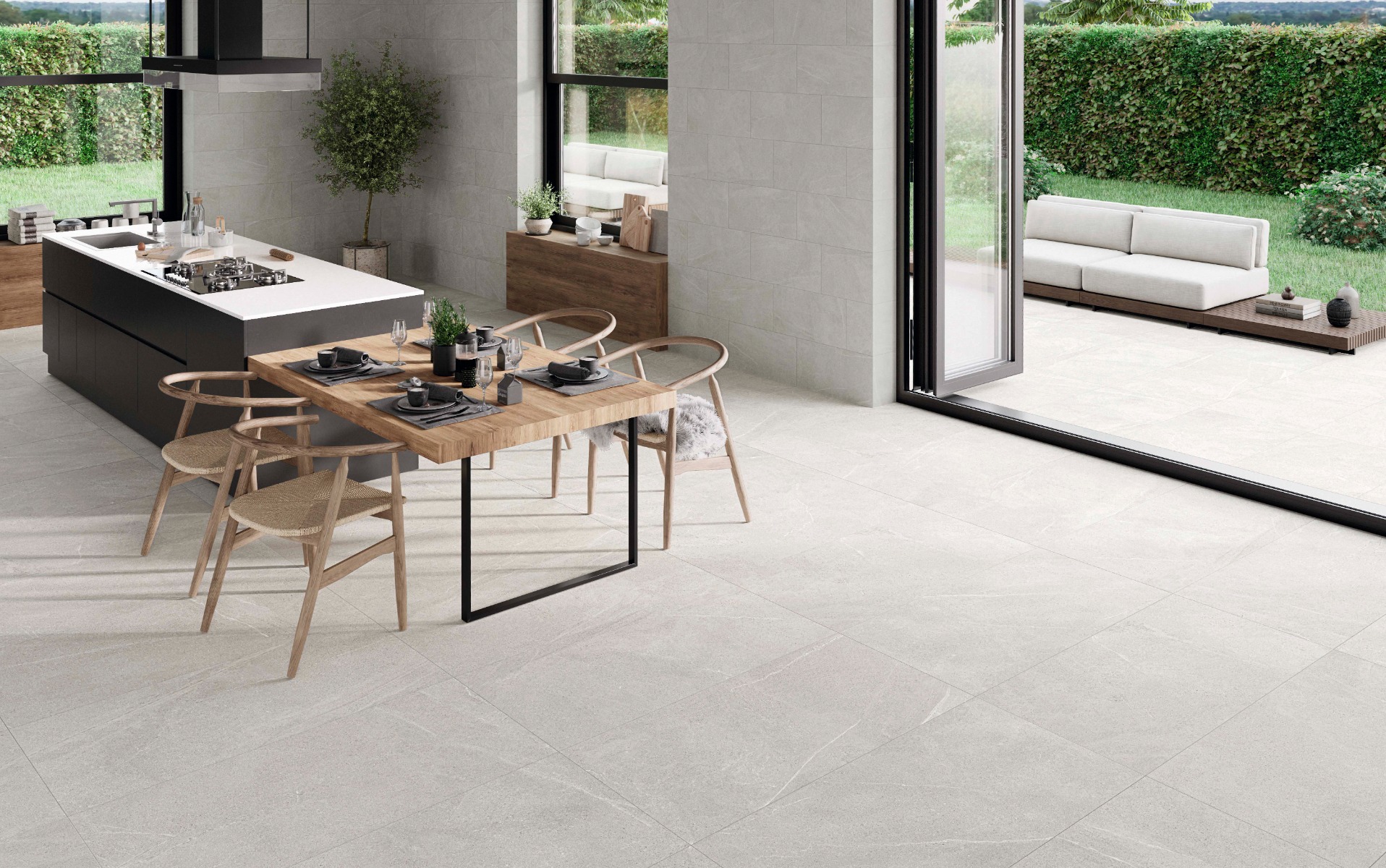 Γρανιτοπλακάκι δαπέδου με εφέ πέτρας της σειράς Bellevue σε χρώμα White και μεγάλης διάστασης 60x60cm. Έχει ματ υφή και αντιολισθητική διάσταση R10 και είναι κατάλληλο για εσωτερικό και εξωτερικό χώρο (IN&OUT).