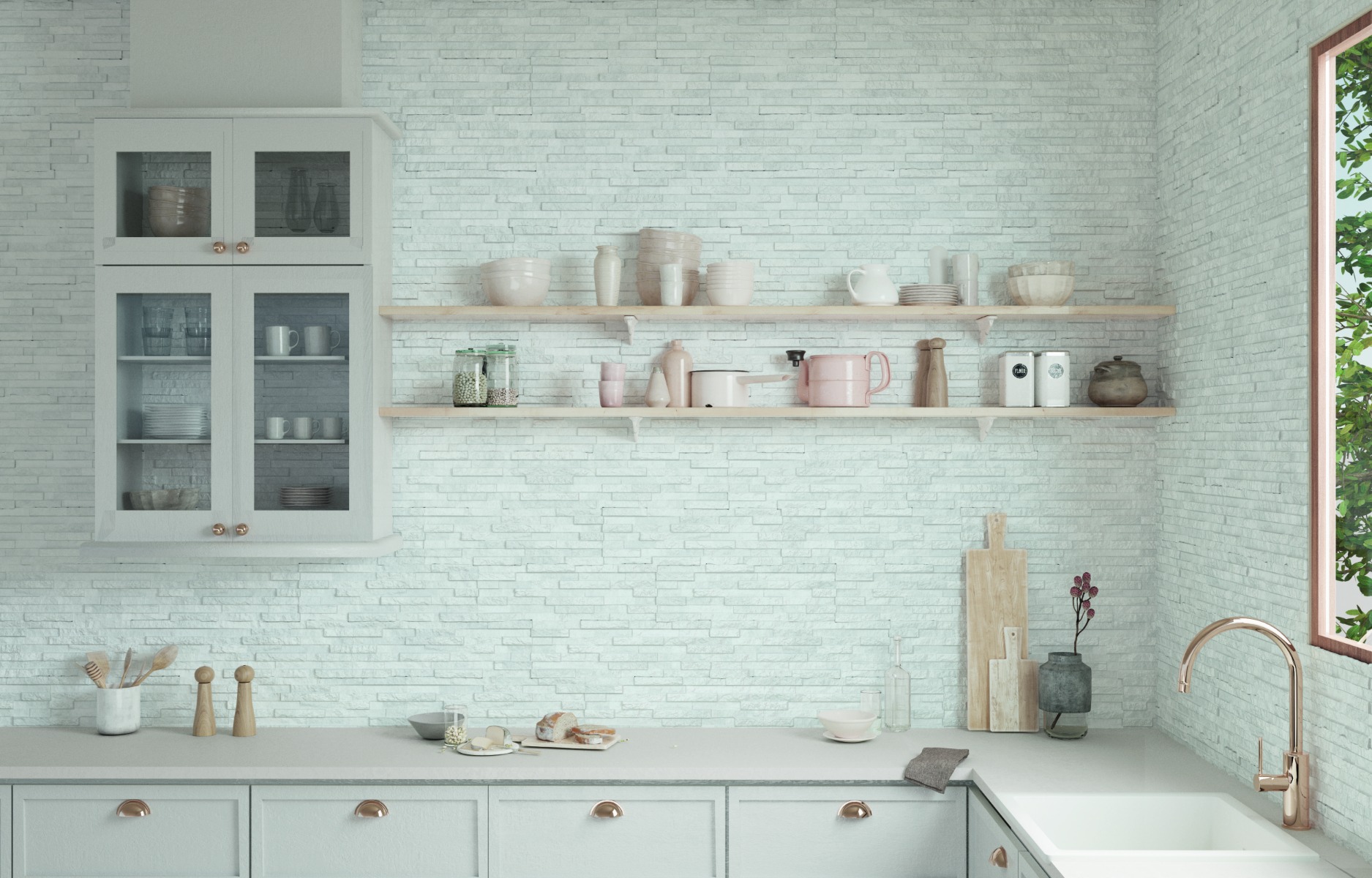 Γρανιτοπλακάκι λευκό σε ύφος πέτρας.’Εχει ματ 3D φινίρισμα και είναι κατάλληλο για τοποθέτηση τόσο για εξωτερικούς χώρους, όσο και για εσωτερικούς τοίχους.