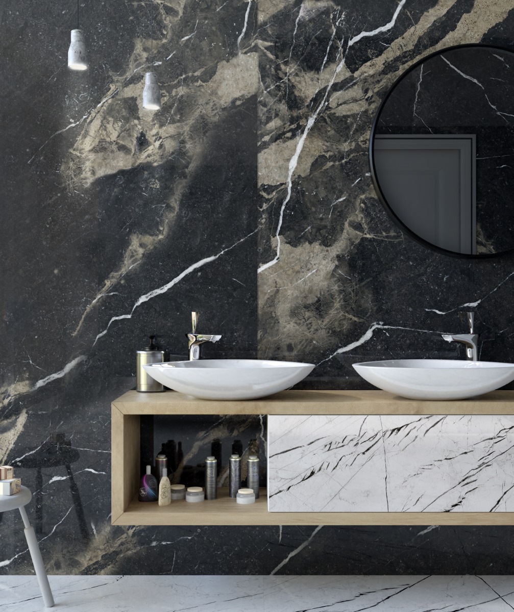 Το Pierre Black είναι ακόμα μια επιλογή σε πλακάκι με ύφος μάρμαρου στη δημοφιλή πλέον διάσταση 60x120cm. Η κλασσική ομορφιά του μάρμαρου, σε σκούρες, μαύρες αποχρώσεις με λευκές φλέβες και μεγάλα καφέ νερά, θα σας εντυπωσιάσει! Αποτελεί ιδανική επιλογή για το μπάνιο σας ή οποιονδήποτε άλλον εσωτερικό χώρο.