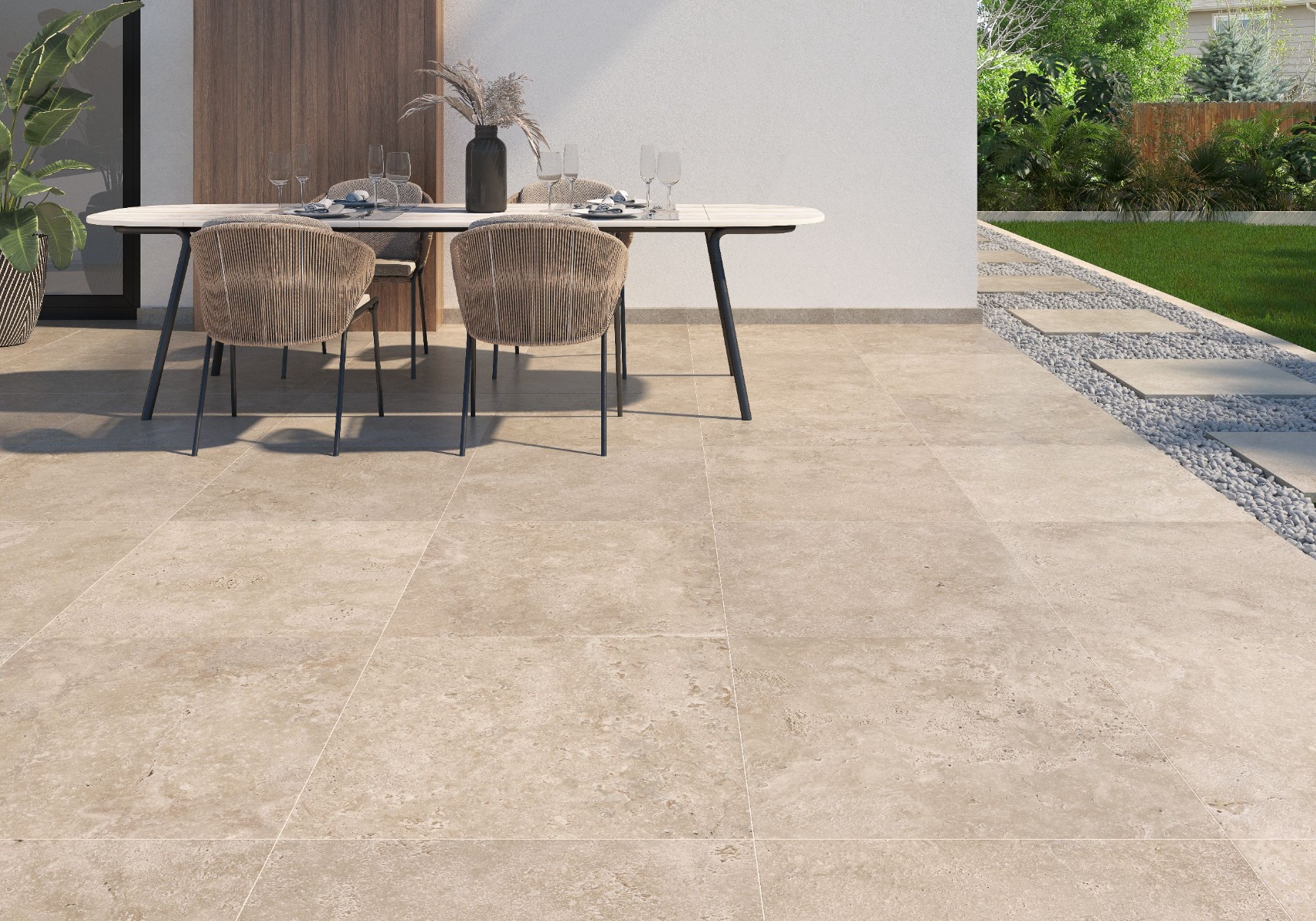 Πλακάκια σε ύφος πέτρας, μπεζ απόχρωσης με ματ υφή μεγάλης διάστασης τετράγωνα 90x90cm.