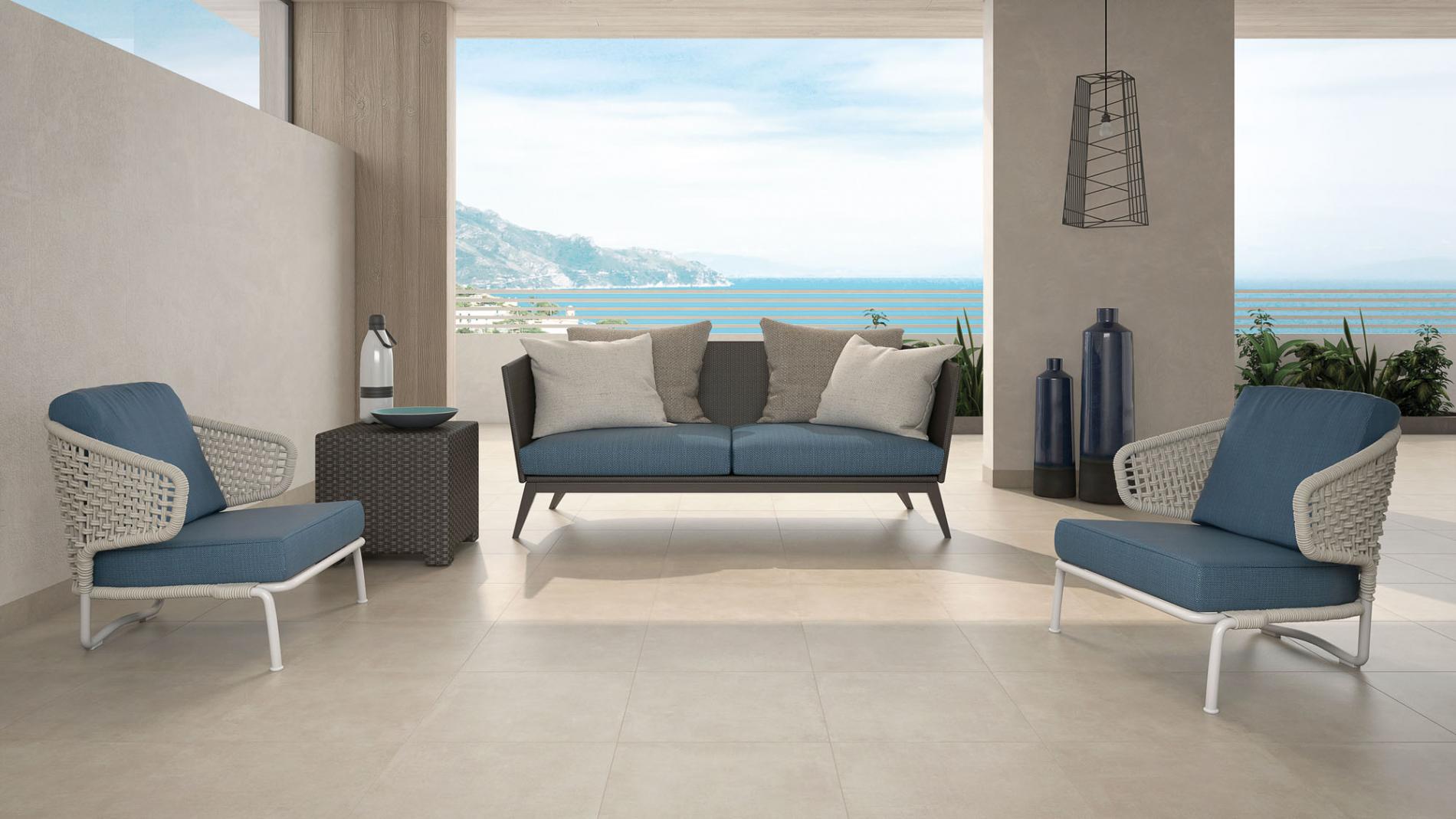 Γρανιτοπλακάκι δαπέδου της σειράς Style Marfil σε ημιγυαλιστερή υφή (lappato) και εφέ τσιμέντου σε μεσαία διάσταση. Κατάλληλο για δάπεδο και τοίχο σε εσωτερικό χώρο.