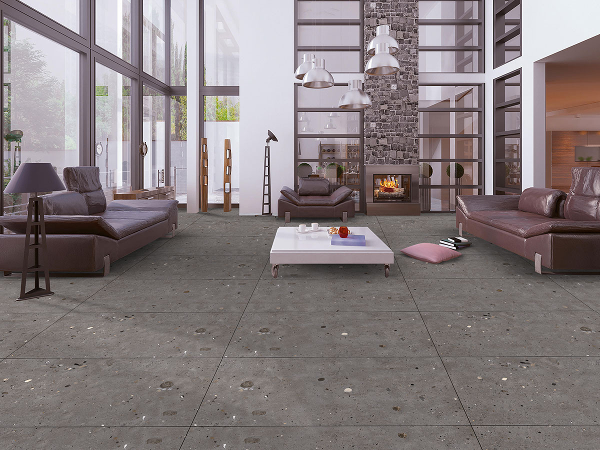 Γρανιτοπλακάκια πρώτης ποιότητας, με ματ υφή R9 δείκτη αντιολίσθησης και και μεγάλη διάσταση 60x120cm. Πρόκειται για πλακάκι με εμφάνιση πέτρας terrazzo σε γκρι αποχρώσεις, ιδανικό για εσωτερικούς και εξωτερικούς χώρους. Κατάλληλο για τοίχους και δάπεδα.