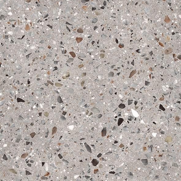 Γρανίτης πρώτης ποιότητας, με ματ υφή R10, σε ύφος πέτρας και μωσαϊκού terrazzo και διάσταση 60x60cm.