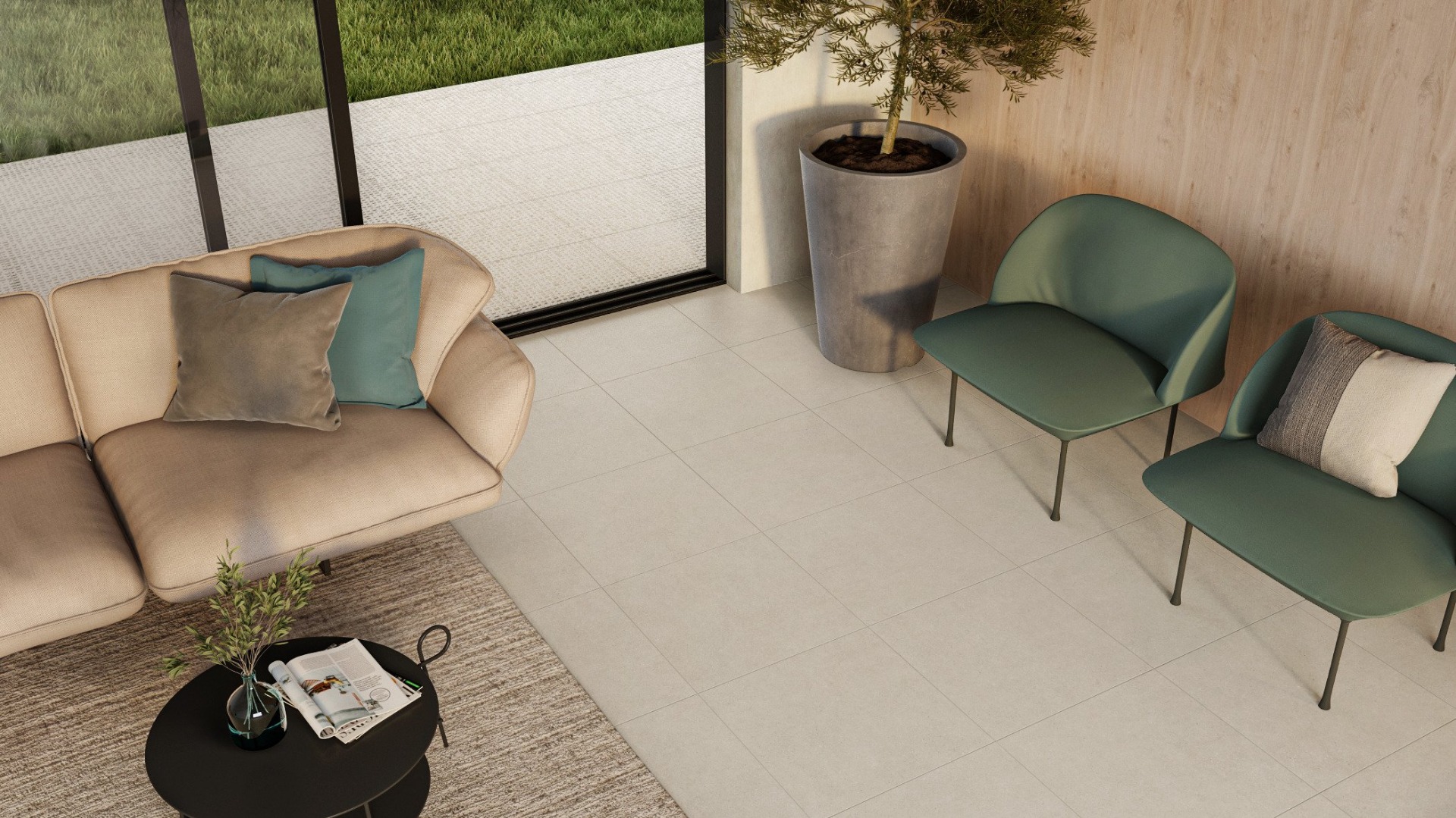 Glazed κεραμικά πλακάκια πρώτης ποιότητας, με ματ υφή ύφος τσιμέντου σε διάσταση 60x60cm και με υψηλό δείκτη αντιολίσθησης R10, κατάλληλα για κάθε εσωτερικό χώρο.