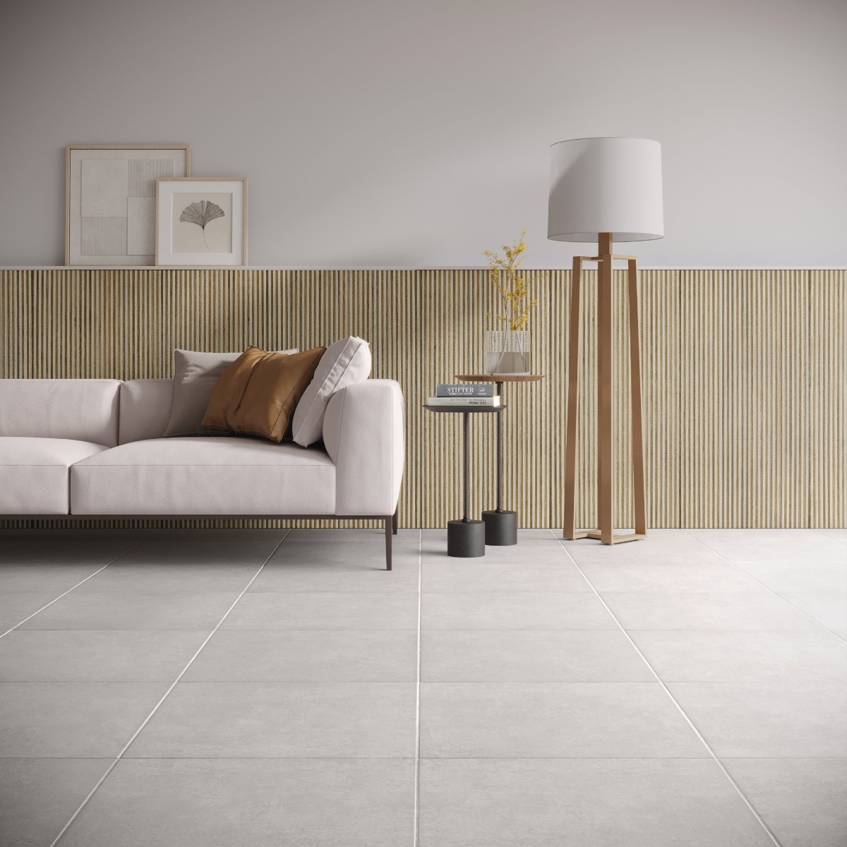 Glazed κεραμικά πλακάκια πρώτης ποιότητας, με ματ υφή ύφος τσιμέντου σε διάσταση 60x60cm και με υψηλό δείκτη αντιολίσθησης R10, κατάλληλα για κάθε εσωτερικό χώρο.