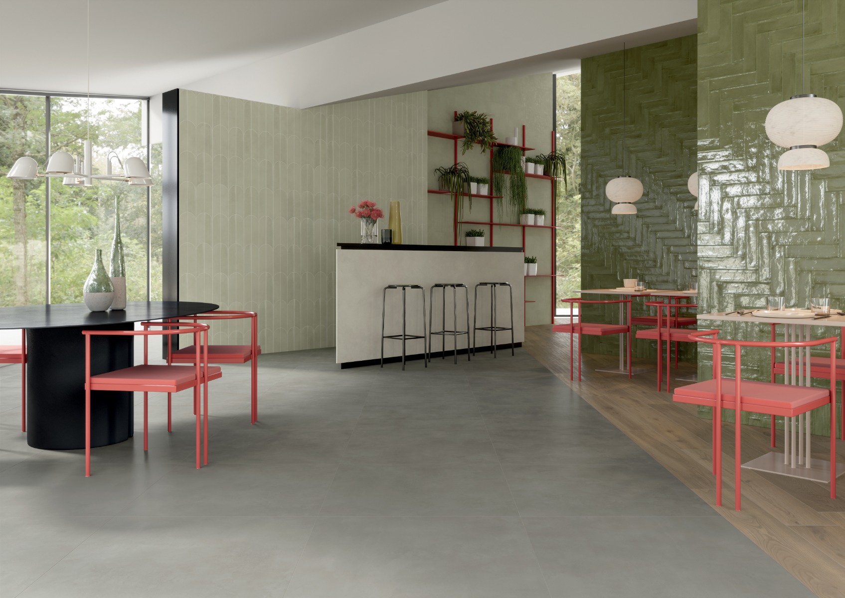 Ενισχύει την ικανότητα των επιφανειών να “ντύνονται”, χάρη στις λύσεις που κυμαίνονται από μικρά τούβλα 7,5x30cm έως μεγάλα μεγέθη, όπως η εξαιρετικά λεπτή πλάκα 120x278cm, από γεωμετρικά σχέδια έως λουλούδια και ευρεία σειρά ψηφιδωτών για εφέ «ταπετσαρίας».