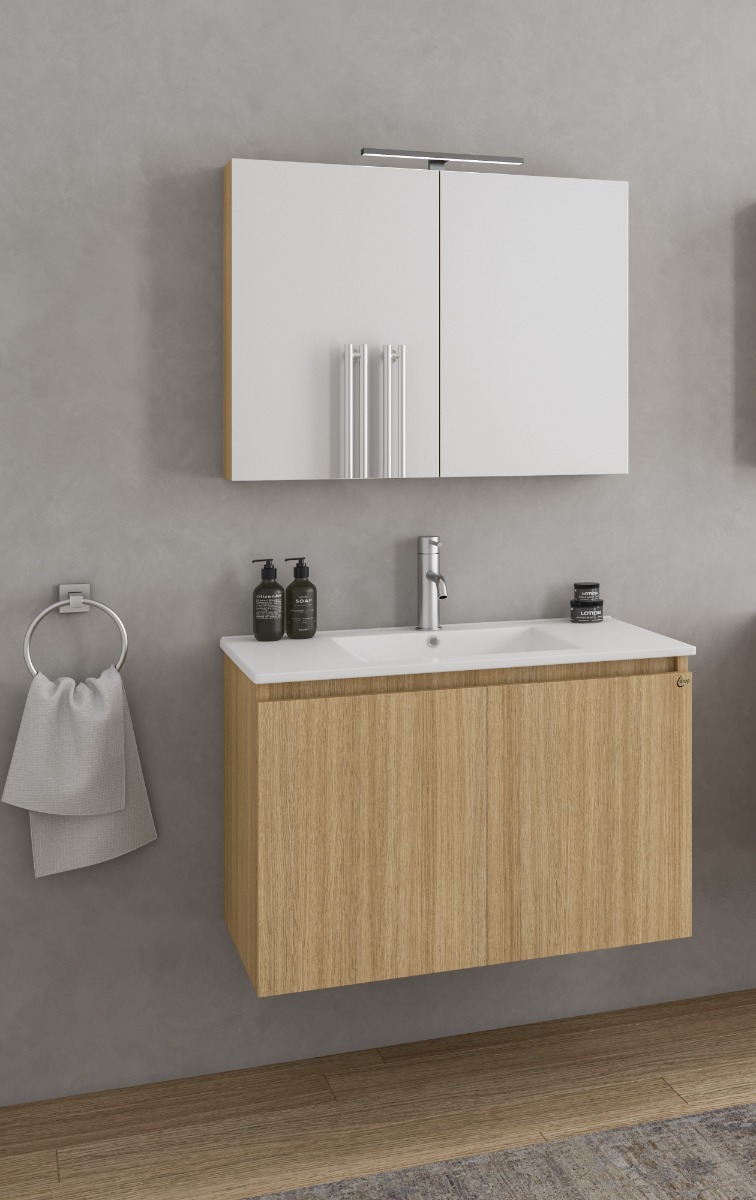 Ολοκληρωμένο σετ επίπλου μπάνιου 3 τεμαχίων της σειράς Verona 75 σε Slavonia Oak χρώμα, από την Drop.