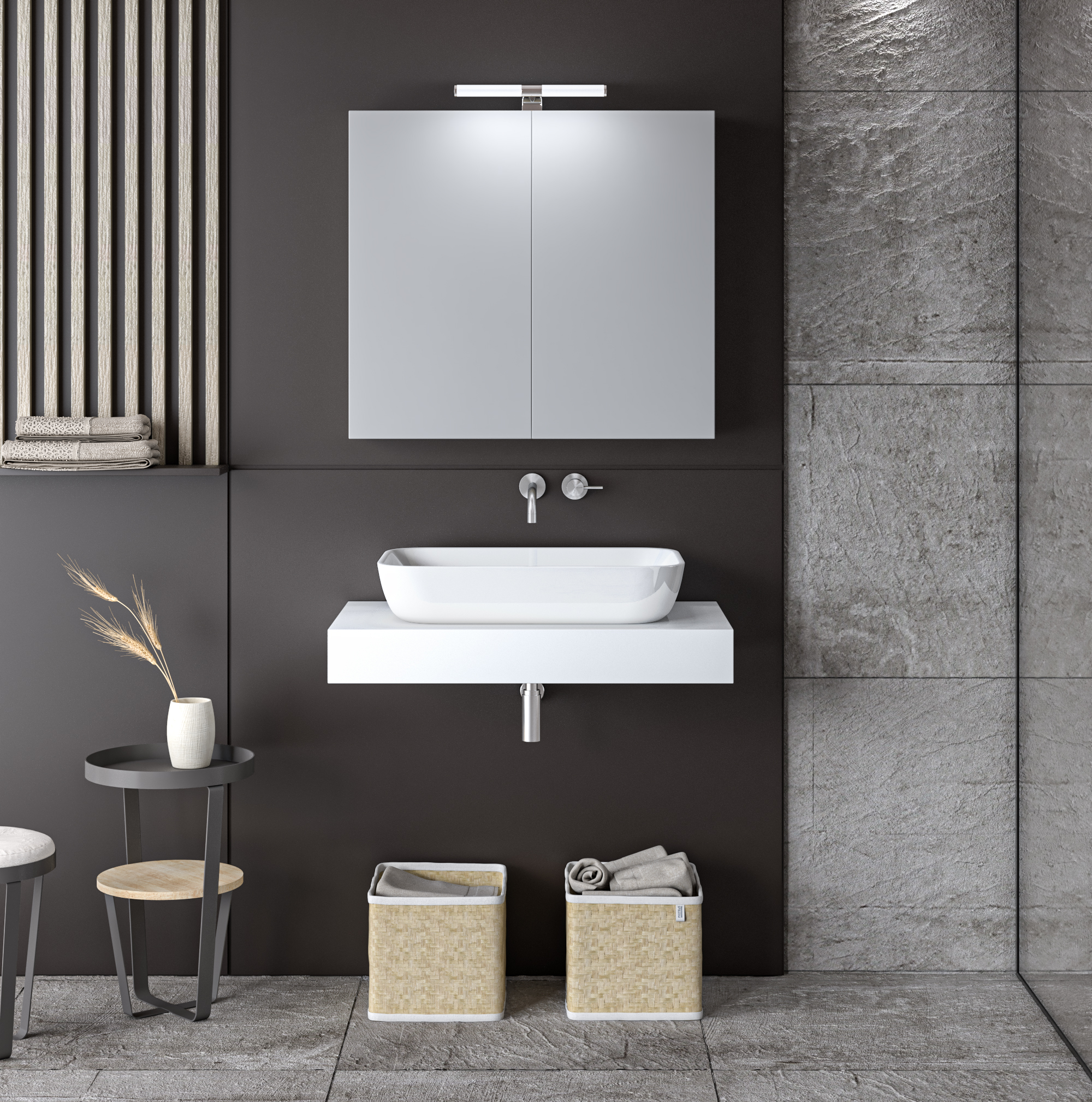 ΣΕΤ ΕΠΙΠΛΟΥ STONE 70cm χρ. ΛΕΥΚΟ με γκρι νερά 9SSTO070WH Αποτελείται από: Sintered Stone κρεμαστή βάση για κορυφαία ποιότητα και υψηλή αντοχή και αισθητική. Σκληρό, ανθεκτικό και ελαφρύ υλικό σε χρώμα άσπρο. Διατίθεται ατρύπητο Καθρέφτης OMEGA Λευκό 75 . Περιλαμβάνει πρόσοψη καθρέφτη με δύο πόρτες. Διαθέτει εσωτερικό ράφι για να οργανώνετε καλύτερα την αποθήκευση χρηστικών αντικειμένων καθημερινής χρήσης για όλα τα μέλη της οικογένειάς σας. Νιπτήρα επικαθούμενο πορσελάνης. Χαρακτηριστικά: Εύκολη τοποθέτηση Ετοιμοπαράδοτα προϊόντα Δεν περιλαμβάνει το φωτιστικό, τη μπαταρία, τη στήλη, τα διακοσμητικά κ τη βαλβίδα. Διατίθεται έτοιμο συναρμολογημένο.