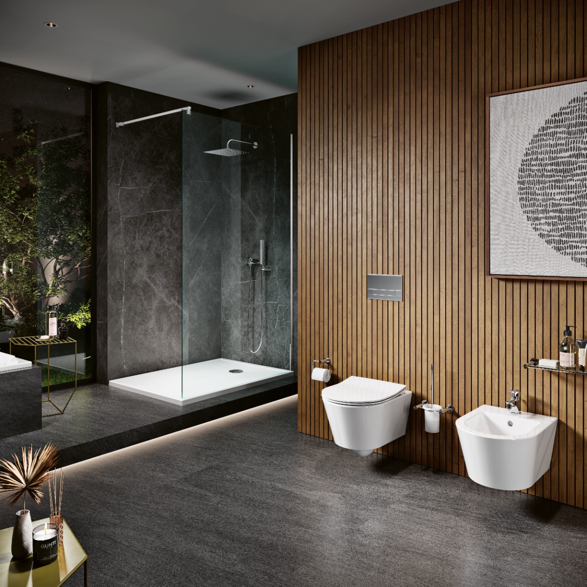 Κρεμαστή λεκάνη με τεχνολογία έκπλυσης rimless μαζί με slim κάλυμμα και σύστημα ελεγχόμενου κλεισίματος soft-close.