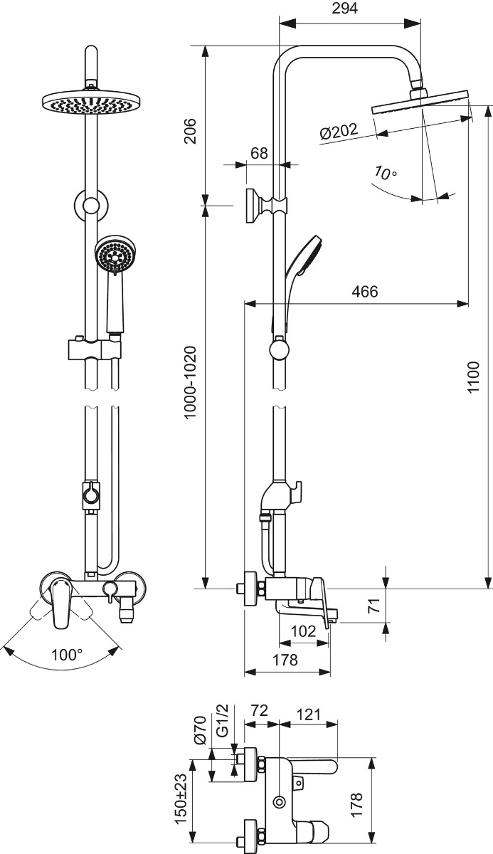 Επίτοιχο σύστημα ντουζ με βέργα και μπαταρία χρωμέ γυαλιστερή από την Ideal της σειράς Seva L. Διαθέτει στρογγυλή κεφαλή 20cm και περιορισμό όγκου ροής νερού στα 9,5lt/min.