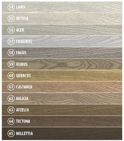 Διαθέσιμος σε 12 φυσικές αποχρώσεις εμπνευσμένες από τα είδη ξύλου που χρησιμοποιούνται συχνότερα για την κατασκευή επενδύσεων παρκέ.