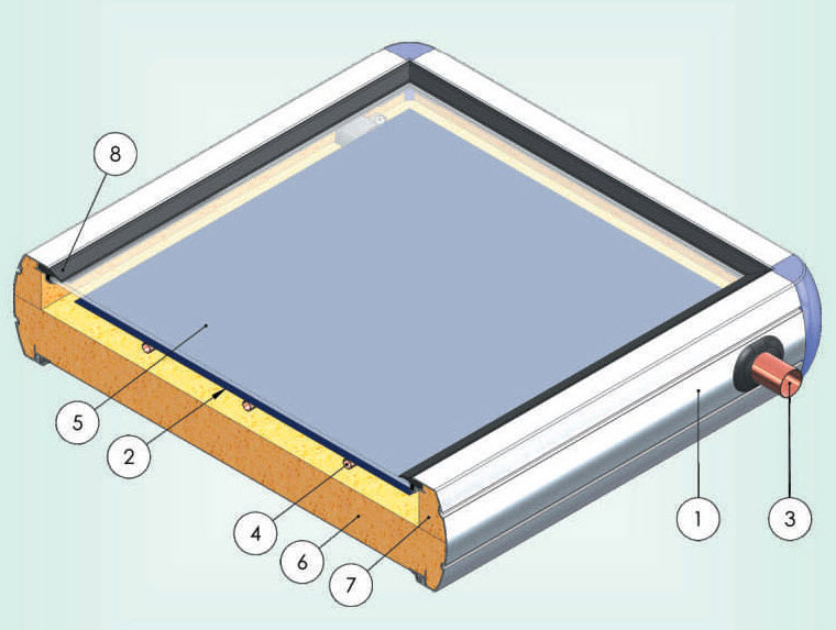- Πλευρική μόνωση συλλέκτη από υαλοβάμβακα πάχους 20 mm για ελαχιστοποίηση της απώλειας θερμότητας (7)