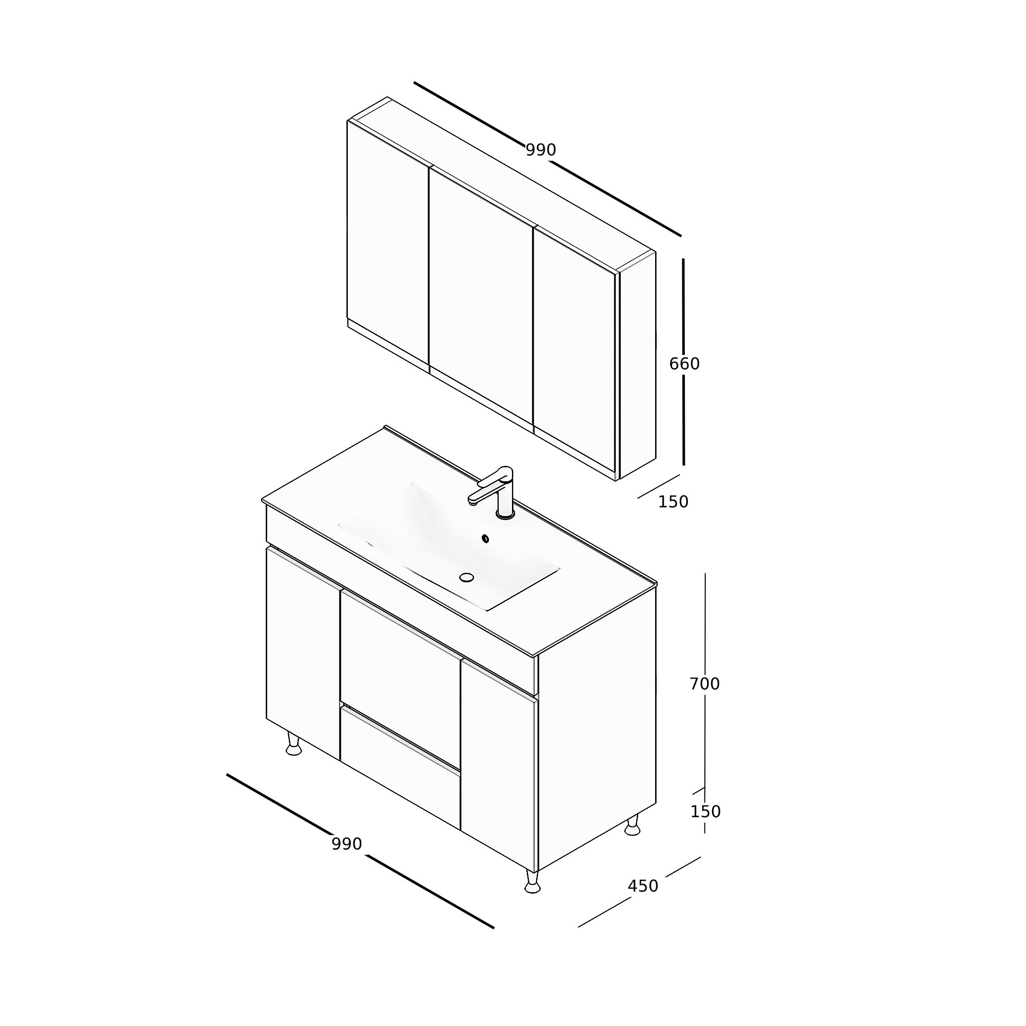 Διαθέτει 2 συρτάρια και ντουλάπια με τεχνολογια soft close και ποδαράκια ύψους 15cm.